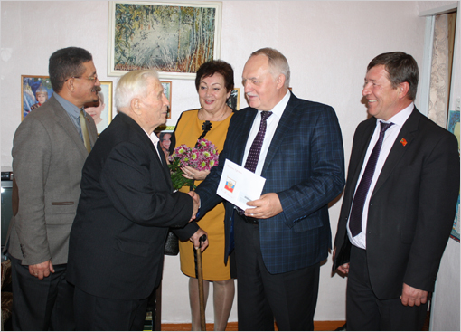 Поздравляя ветерана с серьезной и красивой датой, Александр Король вручил ему подарок от администрации района, а также передал поздравительную открытку от президента России Владимира Путина.