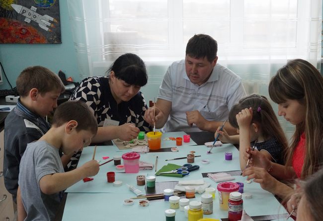 Далее гостей ждал увлекательный мастер-класс: родители совместно с детьми участвовали в составлении семейных панно и картин из лент, картона и глины.