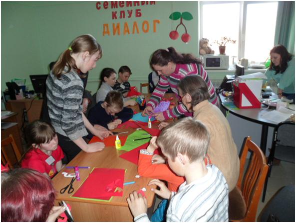 Открытки ветеранам Великой Отечественной войны и труженикам тыла изготовлены детьми и родителями семей, находящихся в трудной жизненной ситуации. Мастер-класс по изготовлению открыток проведён в рамках заседания клуба «Диалог», функционирующего при отделении помощи семье и детям Комплексного Центра. И родители, и дети с удовольствием окунулись в мир совместного творчества.